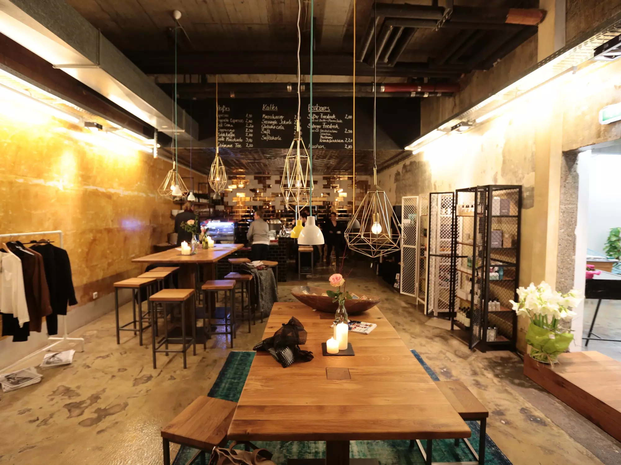 Zwei Highlights in einem Gebäude. Im Ginsburg entsteht mit sparsamem Interieur urbanes Flair – ein Hauch von Kreuzberg in Heidelberg. Nur scheinbar Widersprüchliches wird vereint: Lüftungsschächte und die rohen, klar lackierten Betonwände versprühen den Charme einer illegalen Baustellenparty. Im Kontrast dazu hängen von der Decke liebevoll auf Flohmärkten zusammengesuchte Lampenschirme aus den 50er Jahren. Stilvolle Retro-Accessoires verleihen den Räumen eine wohlig-warme Atmosphäre. Im Friedrich erlebt man Kaffeegenuss und Gaumenfreuden an einer schwarz gekachelten Bar und unter extra aus New York eingeflogenen Deckenfliesen. Und im angeschlossenen Conceptstore gibt´s Fair Fashion mit exklusiven Marken.