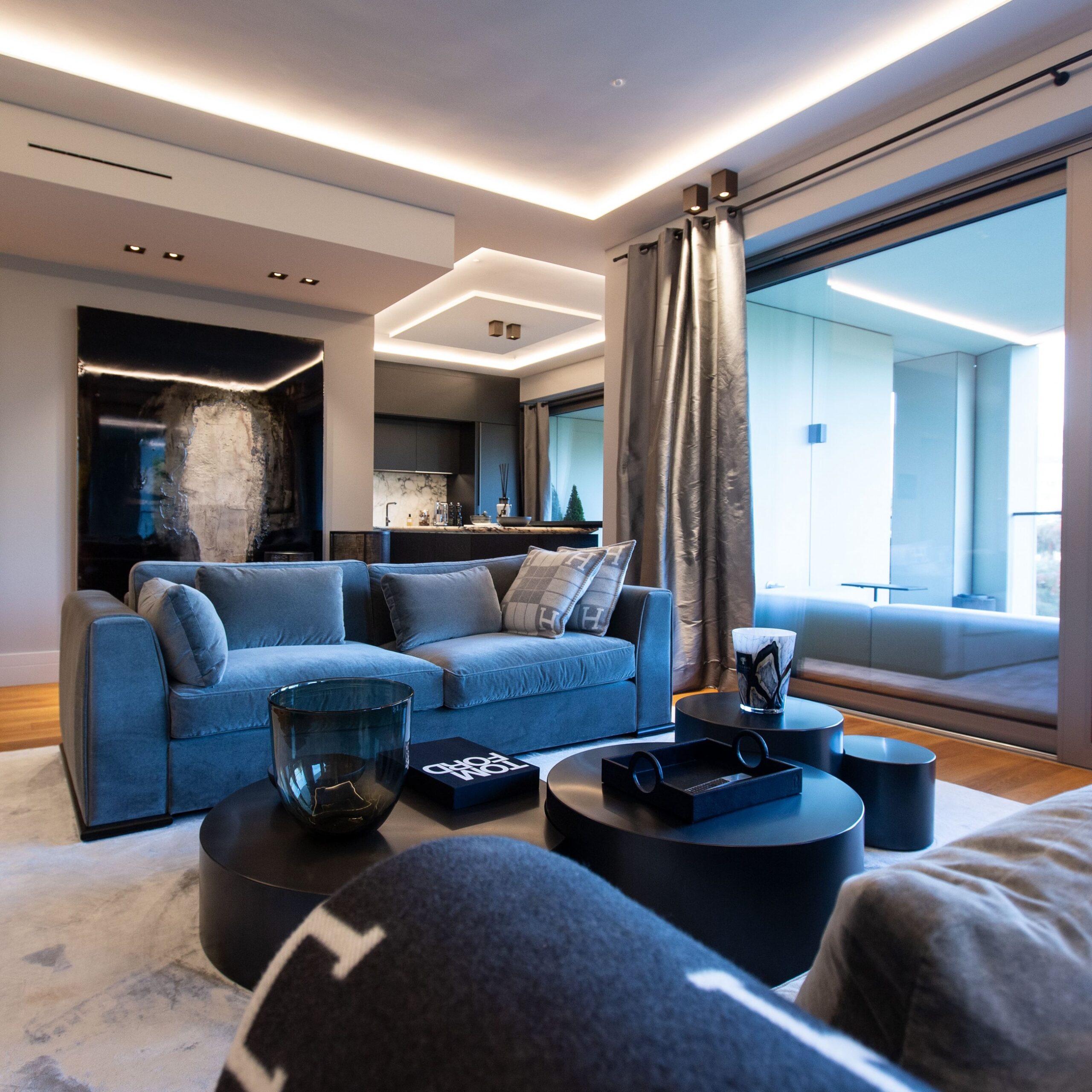 Die Alpha Real Estate Group hat eine Business Loge im Deutsche Bank Park, dem ehemaligen Waldstadion in Frankfurt am Main, und wollte diese zu einer echten Wohlfühloase umgestalten. Der Inhaber der Loge ist großer Eintracht-Fan und wünschte sich eine Art zweites Wohnzimmer, in dem er mit Freunden und Geschäftspartnern Fußballspiele und andere Events genießen kann – und das auch der ideale Ort für berufliche Besprechungen in entspannter Atmosphäre sein soll. Durch das schwarz geräucherte Naturparkett, die neue Lichtplanung, die Überarbeitung aller Oberflächen (Wand und Decke) und die Anpassung auf das neue Möblierungskonzept wurde eine Mini-Apartmentsituation geschaffen. Zusammen mit der Neugestaltung der vorhandenen Innenausbauten und dem Einbau einer maßgefertigten Küche entstand eine „bewohnbare Skulptur“, die als Bühne für die geplante Nutzung dient.